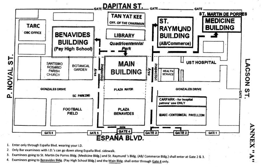 2. Bar examinees assigned to take their examinations at the St. Martin de Porres Building (Medicine Building) and at St. Raymond's Building (AB/Commerce Building) may enter the campus only through Gates 2 or 3 along Espana Boulevard.