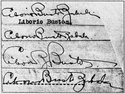 In order to supply a basis of comparison, three signatures of Liborio Bustos Zabala, but appearing once in the form Liborio Z. Bustos, have been brought before us. These three signatures are taken from official documents and about authenticity no question is made. For our own satisfaction, and in view of the importance of the point at issue, we have caused a photograph to be made of these three genuine signature in company with the disputed signature; and as the four signatures were photographed together upon the same card-board backing, all are necessarily upon the same scale.
