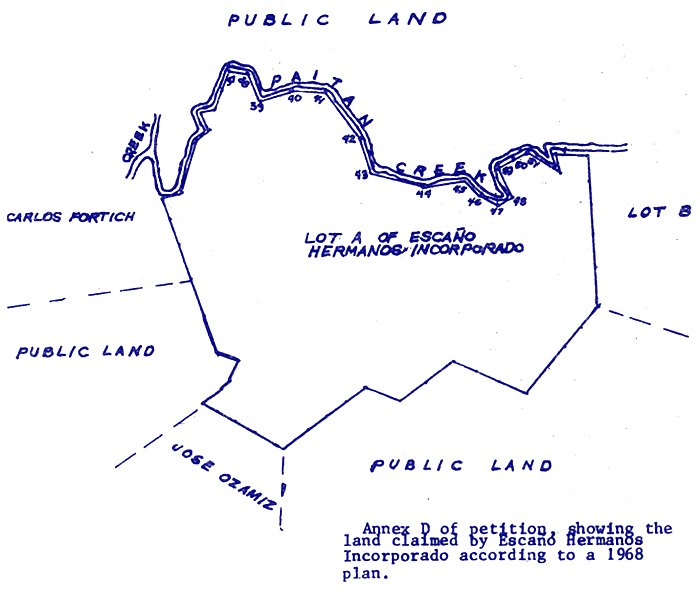 4. That there really exist a gap or a strip of public land bounded on the North by the Paitan Creek, on the South by the property of the Escaño Hermanos, from Comer 47 up to Comer 85 of the property of Escaño relocated