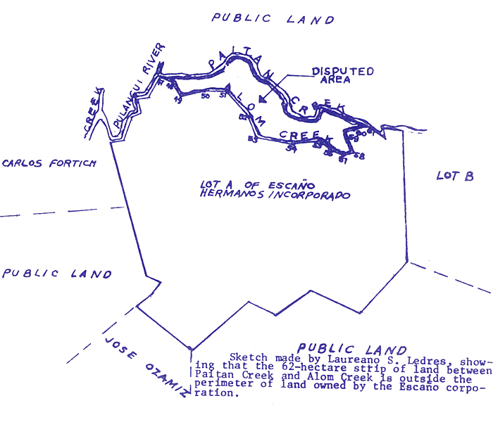 7. The strip of land bounded on the north by the Paitan Creek and on the south mostly by the Alom Creek (from Corner 47 up to Corner 54), is the disputed 62-hectare land. The correct northern boundary of a large portion of the Escaño corporation's land is the Alom Creek and not the Paitan creek.